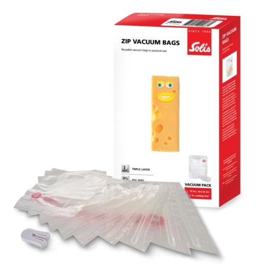 Solis Zip vakuumske vrećice za višekratnu upotrebu idealne su za ljubitelje kuhanja. Set je pogodan za sous-vide kuhanje. Pogodan je i za skladištenje hrane: kada vakuumirate hranu, ona će ostati svježa do 5x dulje. To u konačnici rezultira manjim bacanjem hrane. Zip vakuumske vrećice ne sadrže BPA i sve arome hrane su postojane.