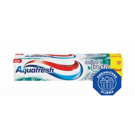 Aquafresh Active Fresh pasta za zube pomaže u sprečavanju propadanja zuba, održava zubno meso zdravim i jača zubnu caklinu. Nježno uklanja naslage. Sadrži osvježavajući okus mente koji dugotrajno osvježava i ostavlja osjećaj čistoće i svježine u ustima. Aquafresh Active Fresh pasta za zube sadrži natrijev fluorid.