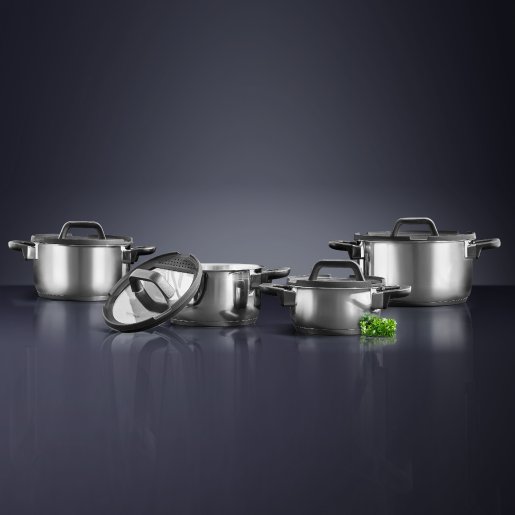 • Set se sastoji od četiri posude promjera 16, 18, 20 i 24 cm, dizajniranih za svestrano kuhanje