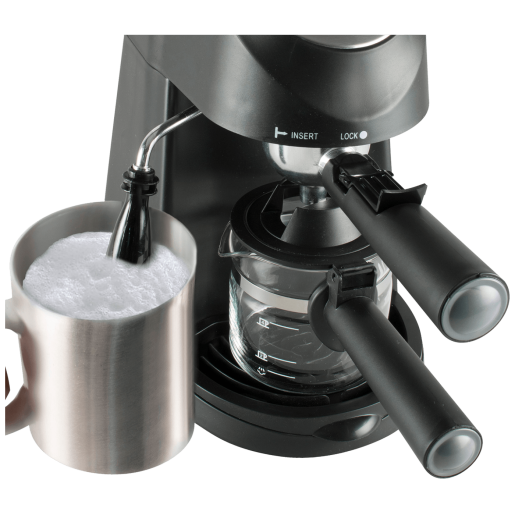 Aparat za esspreso kavu, cappucino, snaga 800W, pogodno za 4 šalice kave, tlak 3.5 bara, funkcija pare, dodatak za mliječnu pjenu za izradu cappuccina, signalno svjetlo, staklena posuda sa izoliranom ručkom, odvojiva posuda za kapanje, jednostavno održavanje, neklizajuće nožice, zaštita od pregrijavanja, dimenzije aparata 170 x 320 x 325 mm, napajanje 230 V ~