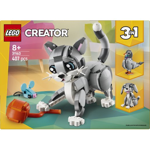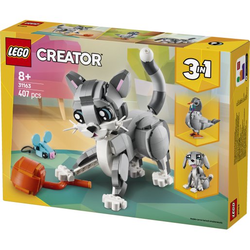 Obradujte ljubitelje kućnih ljubimaca od 8 godina i starije preslatkim kompletom LEGO® Creator 3u1 Razigrana mačka (31163). Komplet igračaka s kućnim ljubimcima uključuje slatku figuru mačke s pokretnom glavom, ušima, repom i nogama, a uz nju dolaze i zdjelica s hranom, figura miša i klupko vune, pa djeca mogu smišljati zabavne priče. Djevojčice i dječaci mogu složiti 3 različita LEGO kompleta sa životinjama od istih kocaka: pomičnu figuru mačke koja može sjediti, stajati i skakati, pomičnu figuru slatkog psa s kosti i goluba s krušnim mrvicama. Sva 3 prizora odlični su LEGO pokloni koje djeca mogu izložiti poslije maštovite igre. Kompleti LEGO Creator 3u1 potiču dječju maštu jer u jednoj kutiji dobivaju 3 različite verzije za slaganje. Uživat će u slaganju, rastavljanju i slaganju novog modela. Linija kompleta 3u1 odgovara najčešćim interesima djece, uključujući superbrza vozila, odlične životinje i detaljne zgrade. Imajte na umu da se modeli ne mogu složiti istodobno.