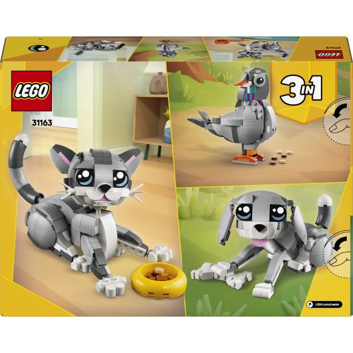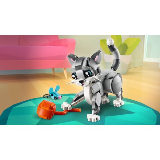 Ovo je savršen LEGO® komplet za slaganje za obožavatelje kućnih ljubimaca! Složi razigranu mačku koja se igra klupkom vune i figurom miša dok ne ogladni. Poslije je pretvori u slatkog psa koji glođe kost ili u radoznalog goluba s okretnom glavom, koji obožava mrvice kruha. Zabava s ljubimcima nikad ne prestaje u sjajnom kompletu 3u1!