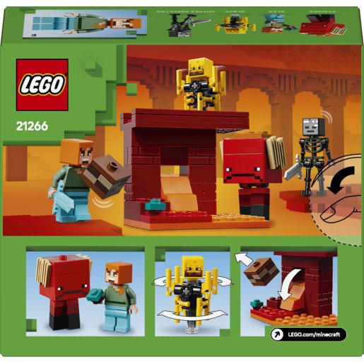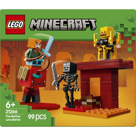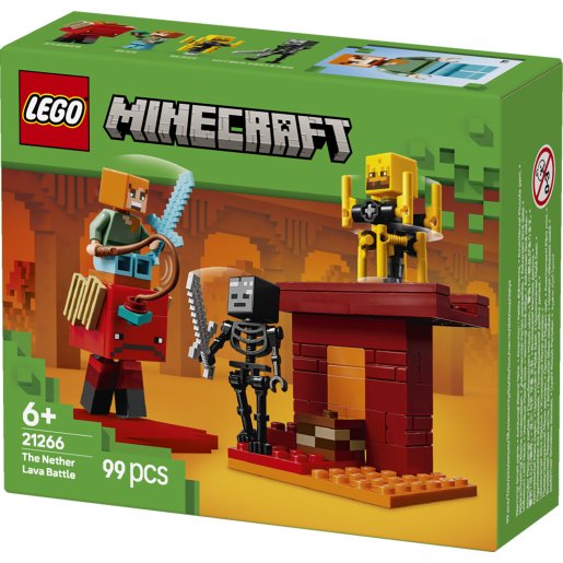 U malom kompletu Bitka uz lavu Nethera (21266) iz linije LEGO® Minecraft® dobivate verziju popularne videoigre za igru i slaganje u stvarnom svijetu. Komplet za razne aktivnosti iz Minecrafta savršen je dar za djecu od 6 godina i stariju jer uključuje popularne figure likova iz videoigre, zabavne elemente i neograničenu akciju. Djeca s akcijskom junakinjom iz Minecraft Alex kreću u misiju uklanjanja drevnih krhotina s dijela mosta utvrde u Netheru u grimiznoj šumi. Kada uklone krhotine, elementi lave automatski padaju, a figure likova iz Minecrafta, kostur iz withera s kamenim mačem i plamenko sa štapom, zaustavljaju Alex u bijegu. Djeca se bore protiv neprijatelja legendarnim dijamantnim mačem, a onda bježe na još jednom liku iz Minecrafta, hodaču, koji ima pomične noge i sedlo. Igrači Minecrafta znaju da moraju doći do zakrivljenih gljivica da mogu upravljati njime. Ako djeca žele još digitalne zabave, u aplikaciji LEGO Builder mogu približavati i okretati trodimenzionalne modele na svom uređaju.