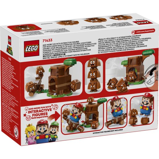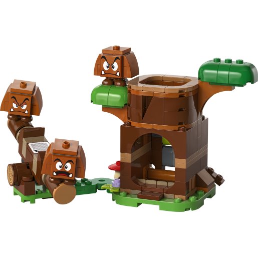 Zabavi se na Goombinu igralištu u kompletu LEGO® Super Mario™. Pritisni polugu da Goomba iskoči iz debla. Igraj se na klackalici s Goombama. Stavi tri Goombe jednog na drugog i napravi toranj Goomba. LEGO® Mario™, LEGO® Luigi™ ili LEGO® Peach™ (figure nisu dio kompleta) mogu doći na igralište i okušati se u interaktivnom izazovu održavanja ravnoteže na klackalici!