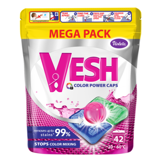 Vesh COLOR POWER deterdžent za rublje prodire duboko u vlakna te uklanja različite vrste teških i upornih mrlja, ostavljajući rublje besprijekorno čistim. Namijenjen je pranju obojene odjeće, sa težim mrljama. Može se koristiti za sve vrste obojenih tkanina, bez potrebe za dodatnim sortiranjem rublja.