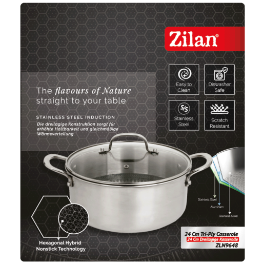 Kaserola sa staklenim poklopcem 24 cm, Zilan, ZLN9648 • Pržite i kuhajte na minimalno ulja • Trostruko posuđe izrađeno od aluminija između dva sloja nehrđajućeg čelika • Nudi maksimalno zadržavanje topline i dugotrajnu izdržljivost • Može se prati u perilici posuđa • Poklopci od kaljenog stakla